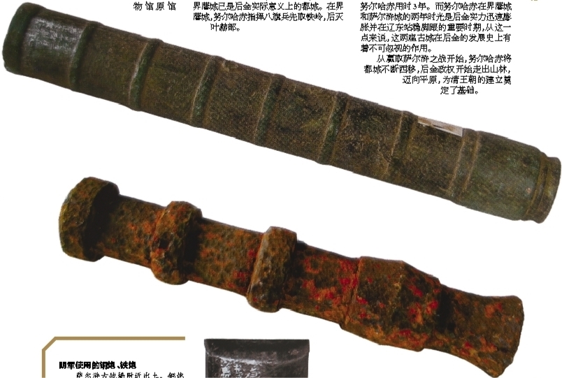 明軍使用的銅炮、鐵炮 薩爾滸古戰(zhàn)場附近出土。銅炮通長73.5厘米,內徑6.5厘米。整體呈竹節(jié)狀,在炮膛中間置一火線圓孔,第一節(jié)處刻有“庚午二月匠人制,吾松監(jiān)鑄。為正元”銘文。相比之下,鐵炮略短,通長63.8厘米,內徑5.2厘米。在當時,這兩種火炮屬先進武器。