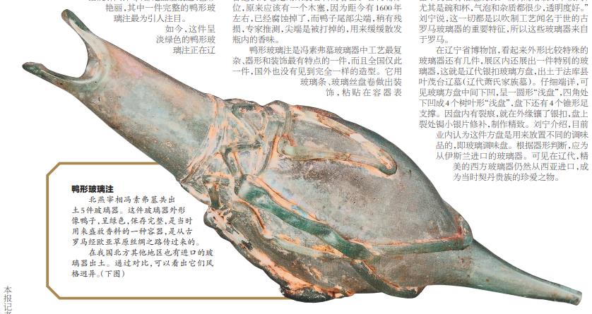 如今,這件呈淡綠色的鴨形玻璃注正在遼博展出。記者在展臺前看到,玻璃注形狀像一只鴨子,器口好似大張的鴨嘴,長長的脖子,圓鼓鼓的肚子,還有細長的尖尾巴,頸部裝飾了一圈紋帶,好似花色羽毛。