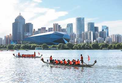 8月23日,處暑。遼寧省沈陽市第十二屆龍舟大獎賽在沈陽市渾河城市中心段舉行。圖為參賽隊(duì)伍在競速結(jié)束后返回起始點(diǎn)。