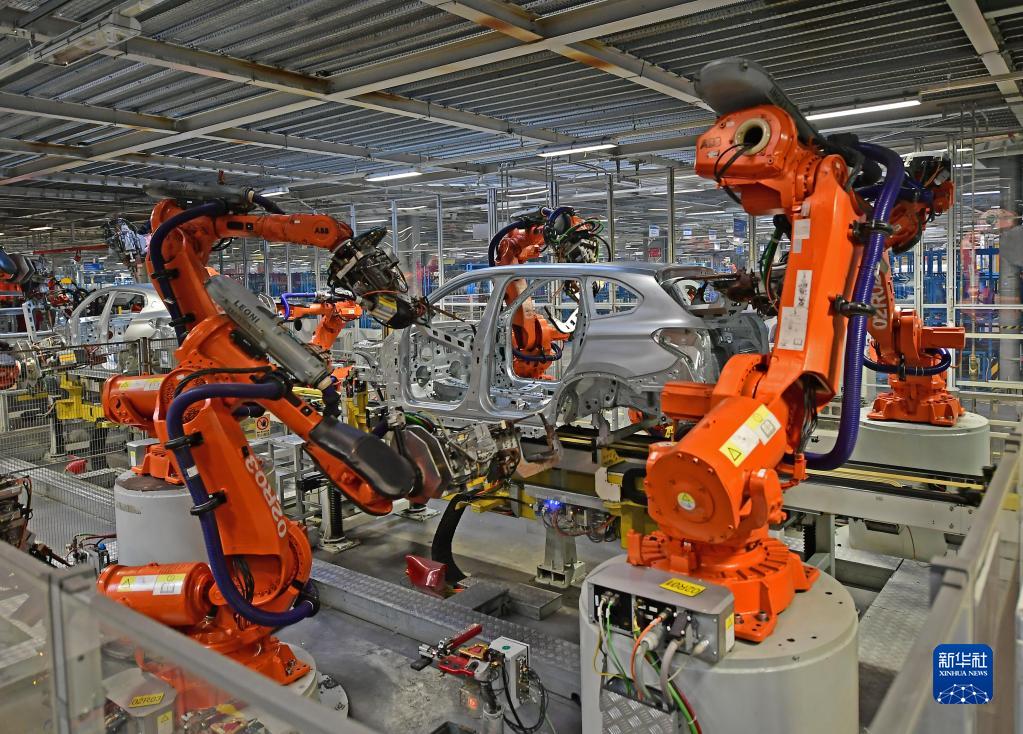 2022年2月16日,在華晨寶馬沈陽鐵西工廠車身車間,機(jī)器臂在焊接車身。