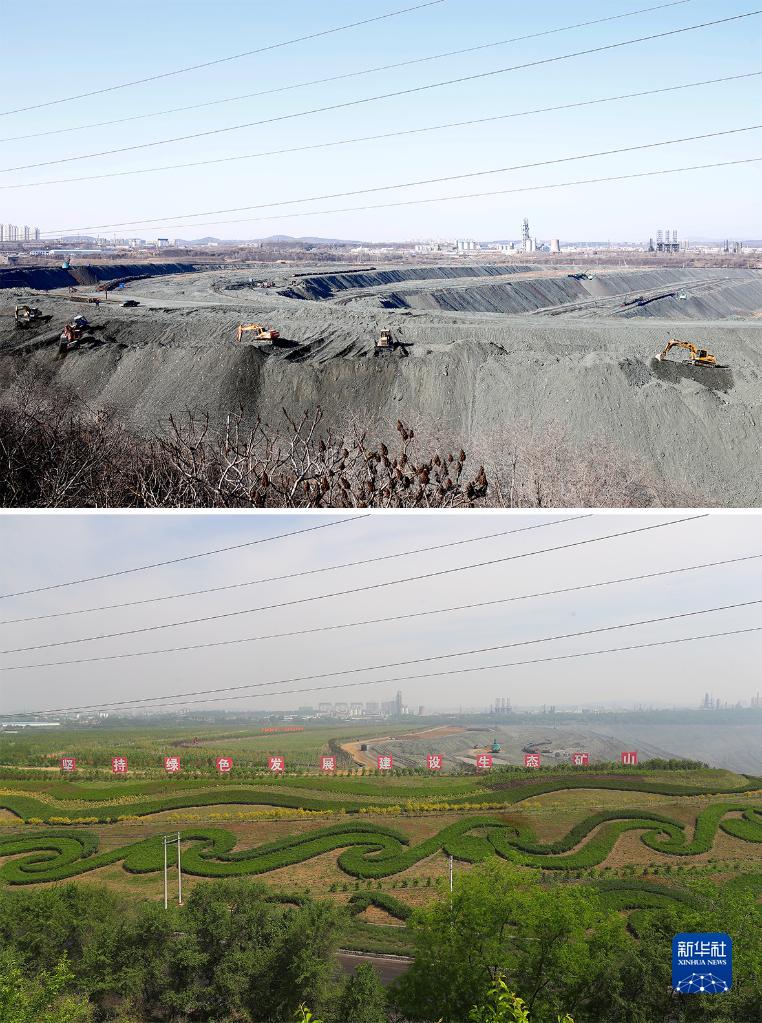 這是一張拼版照片:上圖為遼寧省撫順市西露天礦部分區(qū)域生態(tài)恢復(fù)前的場(chǎng)景(2019年3月6日攝,資料照片);下圖為2022年6月2日拍攝的遼寧省撫順市西露天礦部分區(qū)域生態(tài)恢復(fù)后的場(chǎng)景(新華社記者楊青攝,無人機(jī)照片)。新華社發(fā)