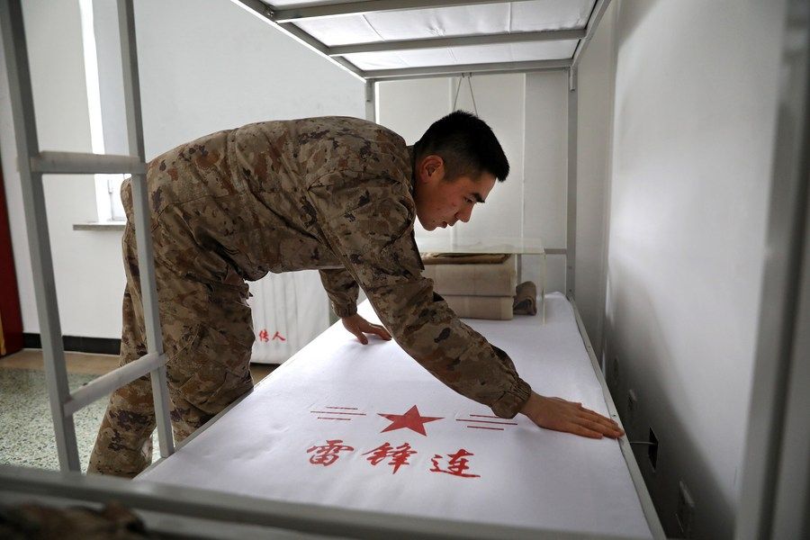 戰(zhàn)士舒騰在整理雷鋒床鋪。新華社記者 姚劍鋒 攝