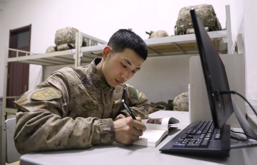 戰(zhàn)士任亮在標(biāo)記重點(diǎn)讀書內(nèi)容。新華社記者 姚劍鋒 攝