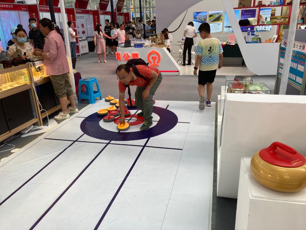 6月18日,一名參觀者在第三十二屆哈洽會體驗旱地冰壺。新華社記者 金地 攝