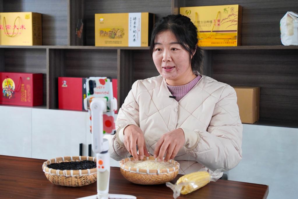 張雪在直播間里向客戶介紹五常大米。新華社記者 魏弘毅 攝