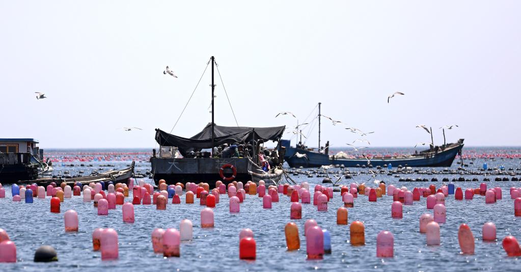 大連市長海縣海洋島鎮的漁民在海洋牧場作業。新華社記者 姚劍鋒 攝