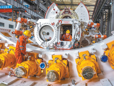 廣東佛山市順德區中鐵華隧聯合重型裝備有限公司,工人們在調試盾構機。