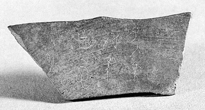 比陶寺更早的漢字出土于距今七千年前的湖北秭歸柳林溪,目前已發現八個單字,是迄今所知明確無誤的最早的漢字。一件頂面刻有八組“五田文”的陶支座(圖4),“五”字與甲骨文的“五”字相同,但更原始;“田”字則與甲骨文用于農田的“田”字別無二致;而“文”字的寫法則與甲骨文完全一樣,其作為漢字的祖先是毋庸置疑的。