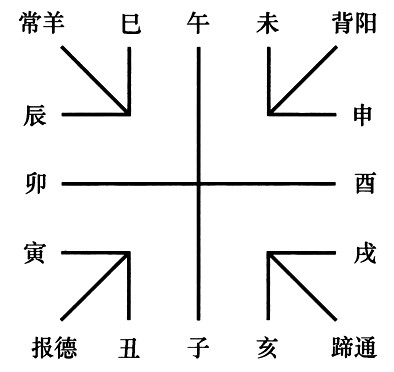 八組“五田文”刻于九宮的空間背景極具意義。人類最早的知識體系是他們對空間和時間有意識地進行的規劃,立表測影最先規劃的空間圖形是二繩,爾后發展出四鉤和四維。古人以所立之表為圓心,以一定的長度為半徑畫圓,在日出和日落時分別記錄表影與圓周的交點,以繩連接兩點的直線方向就是東西;同時取兩點的中點,以繩連接與表的垂直方向就是南北。兩條繩子形成的“+”形圖像名為“二繩”,其空間概念就是五方。如果配以十二支,指向東西的繩是卯酉繩,也叫卯酉線;指向南北的繩是子午繩,也叫子午線。中國的子午線就是這樣測得的。二繩空間并不具有面積的意義,先民從紡織獲得靈感,通過無限積績二繩的做法,使二繩具有了面的意義,這一空間即是五位,也叫日廷。日廷五位的四角必然留有四個矩形缺口,古人稱為“四鉤”。二繩和五位都屬于五方空間,如果古人需要認識比五方更多的方位,那就必須認識東北、西北、東南和西南四個方位,這就是“四維”。將二繩、日廷與四維重疊,便形成中國傳統空間的完整圖形——九宮,其至少表現了八方和中央九個方位。《淮南子·天文》:“子午、卯酉為二繩,丑寅、辰巳、未申、戌亥為四鉤。東北為報德之維也,西南為背陽之維,東南為常羊之維,西北為蹄通之維。”描述的就是這個圖形。(圖5)