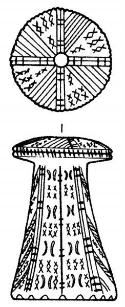 天蓋須有天柱支撐,古人對于天柱的認識,同樣為以時空認知為核心的中華文明宇宙觀的起源提供了佐證,對漢字及華夏文明起源的研究具有重要意義。《天問》:“天極焉加?八柱何當?”天柱不僅設于八方邊隈,而且中央天柱還要直居天極之下。其實柳林溪出土的大量陶支座,其形狀正作支撐天蓋的天柱的模樣,甚至有的陶天柱上還刻寫著漢字“朱”字(圖6)。